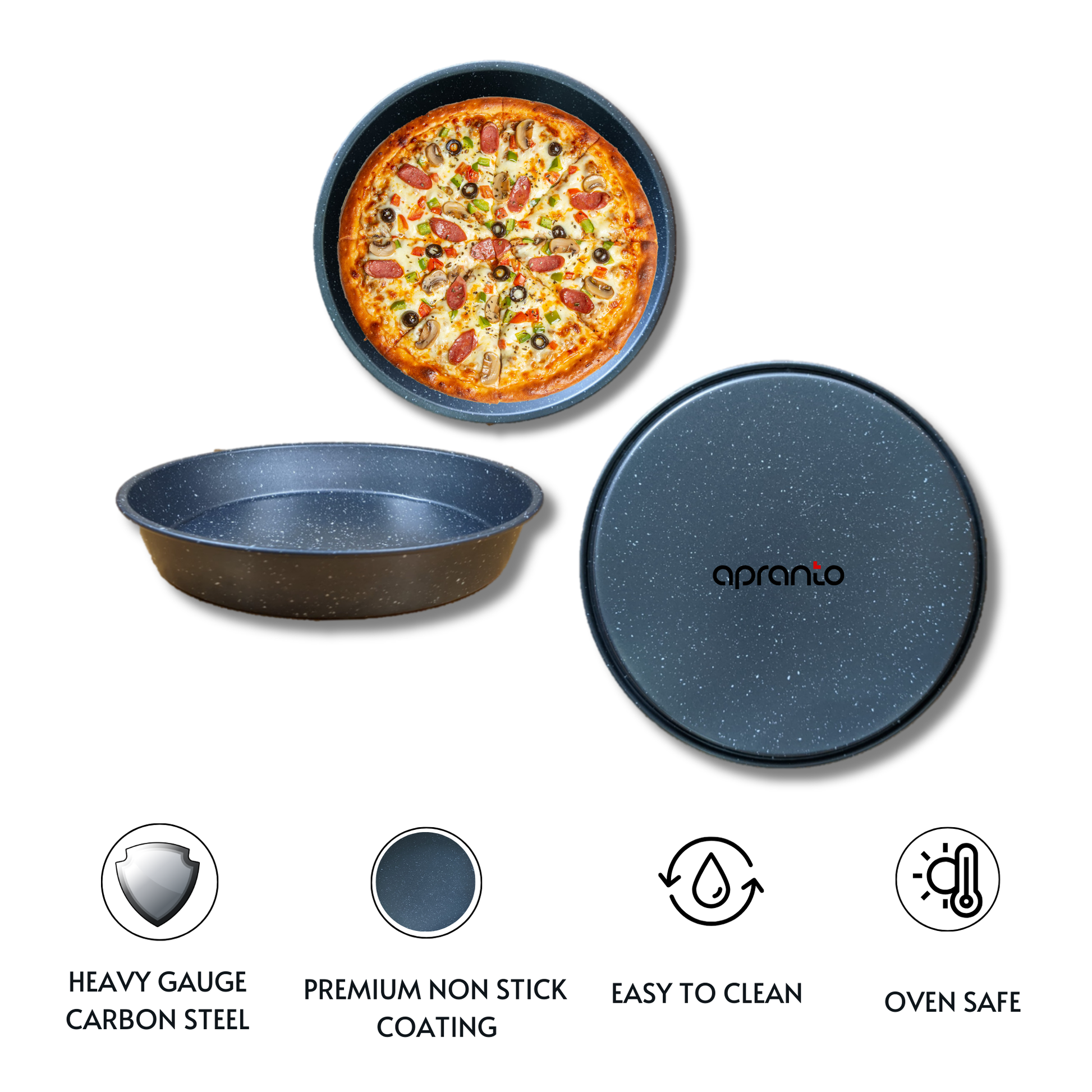 Constructed from durable, heavy-duty steel, our pizza pan ensures even heat distribution for a perfectly crispy crust every time. Its non-stick surface guarantees easy release and hassle-free cleanup, so you can spend less time scrubbing and more time enjoying your delicious creations. Whether you're a seasoned pizza pro or a novice in the kitchen, our pizza pan is perfect for crafting gourmet pizzas, calzones, flatbreads, and more. Its versatile design makes it suitable for use in ovens, grills, or even over a campfire, giving you endless culinary possibilities. Say goodbye to soggy bottoms and unevenly cooked pizzas – with our pizza pan, every slice will be a slice of perfection. Upgrade your kitchen arsenal today and start baking mouthwatering pizzas that rival your favorite pizzeria!